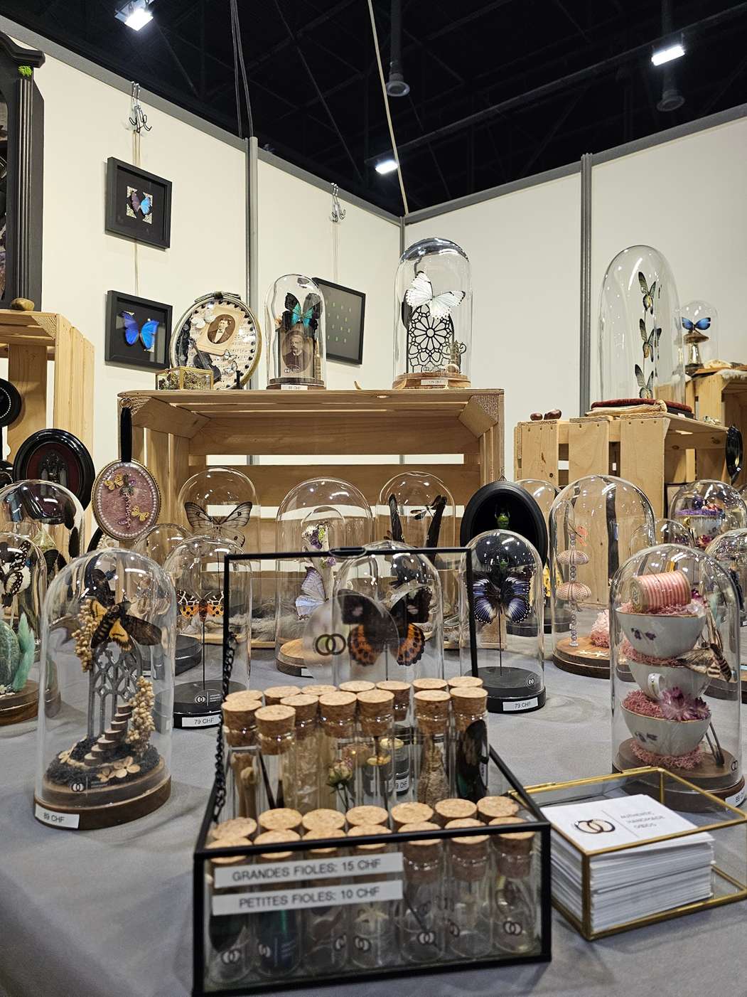 D’autres artistes montrent leur talent en temps réel, maquillant le visage d’une passante, peignant un portrait, sculptant une œuvre à base de crânes stylisés, ou une bouche en papier mâché. Verre, acrylique, papier, acier, toutes les matières sont travaillées en des objets toujours atypiques, souvent inattendus. En témoigne le stand de Ruby Handmade Goods, artiste d’entomologie, qui donne vie à ces êtres de l’éphémère, des papillons aux coléoptères. C’est en héritant de sa grand-mère d’un cadre de spécimens de papillons que Ruby en a fait sa passion. Une façon pour elle de faire chatoyer les couleurs fascinantes de ces trésors qu’elle récupère d’anciennes collections ou d’actions de régulations. Ses créations uniques la font voyager et sont l’occasion de sensibiliser à la beauté et à la singularité de ces êtres minuscules.