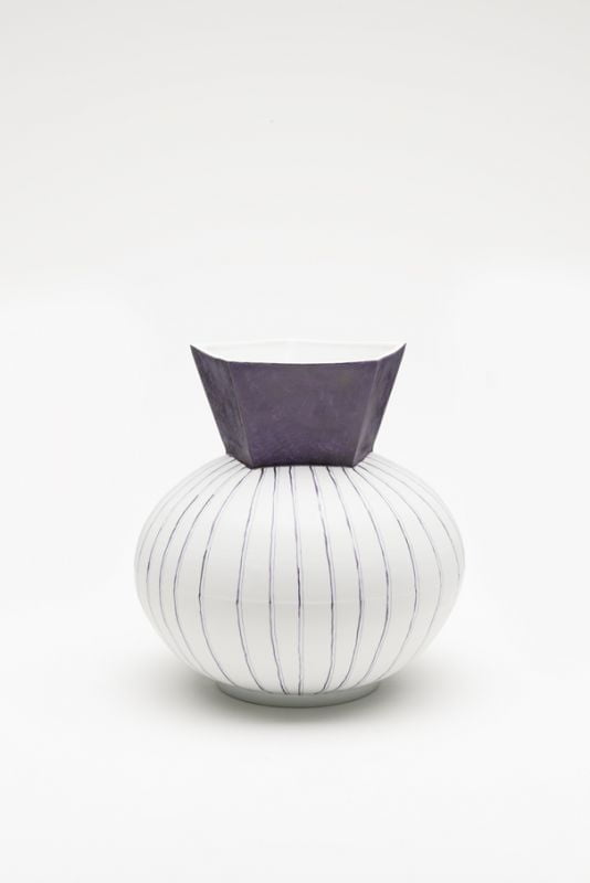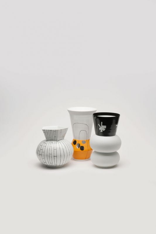 Tout est prétexte à expérimenter des effets: les surfaces des vases déclinent élégamment différentes formes de modelage. Elles sont à la fois brutes et polies, émaillées et opaques, décorées, blanches et colorées. La réception de la lumière devient un jeu à facettes multiples, depuis les reflets brillants sur un bord lisse, en passant par les subtils et sobres changements sur un ventre rond, aux ombres vibrantes des marques du tournage sur un cou allongé. Eloge de l’imperfection, la décoration peinte est abstraite et souligne, dans ses traits incertains et indéfinis, la valeur du hasard et la temporalité du geste.